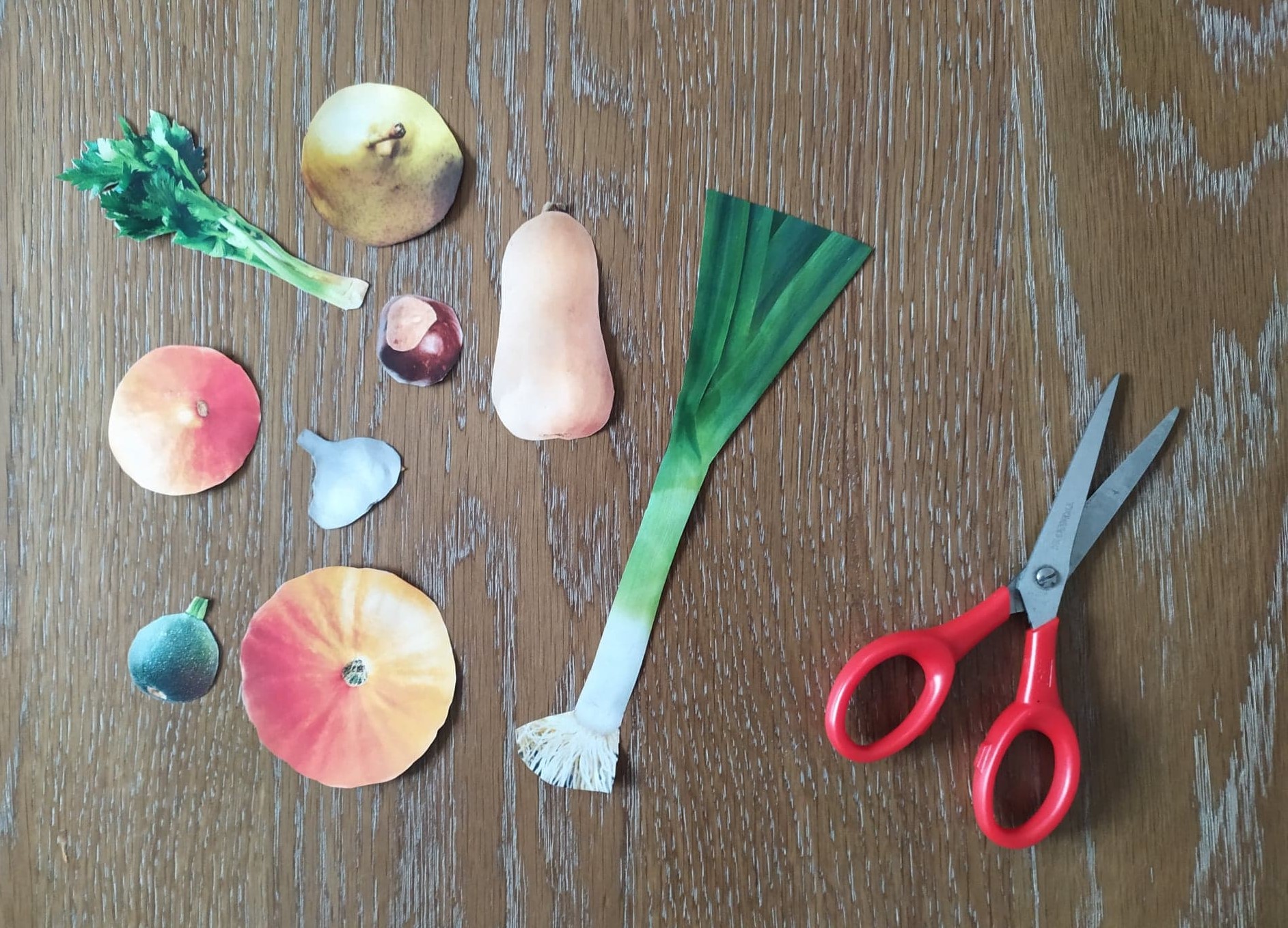 Collecter des prospectus contenant des images de fruits et légumes ou imprimer des photos à partir d’une banque d’images libres de droit comme Pixabay.