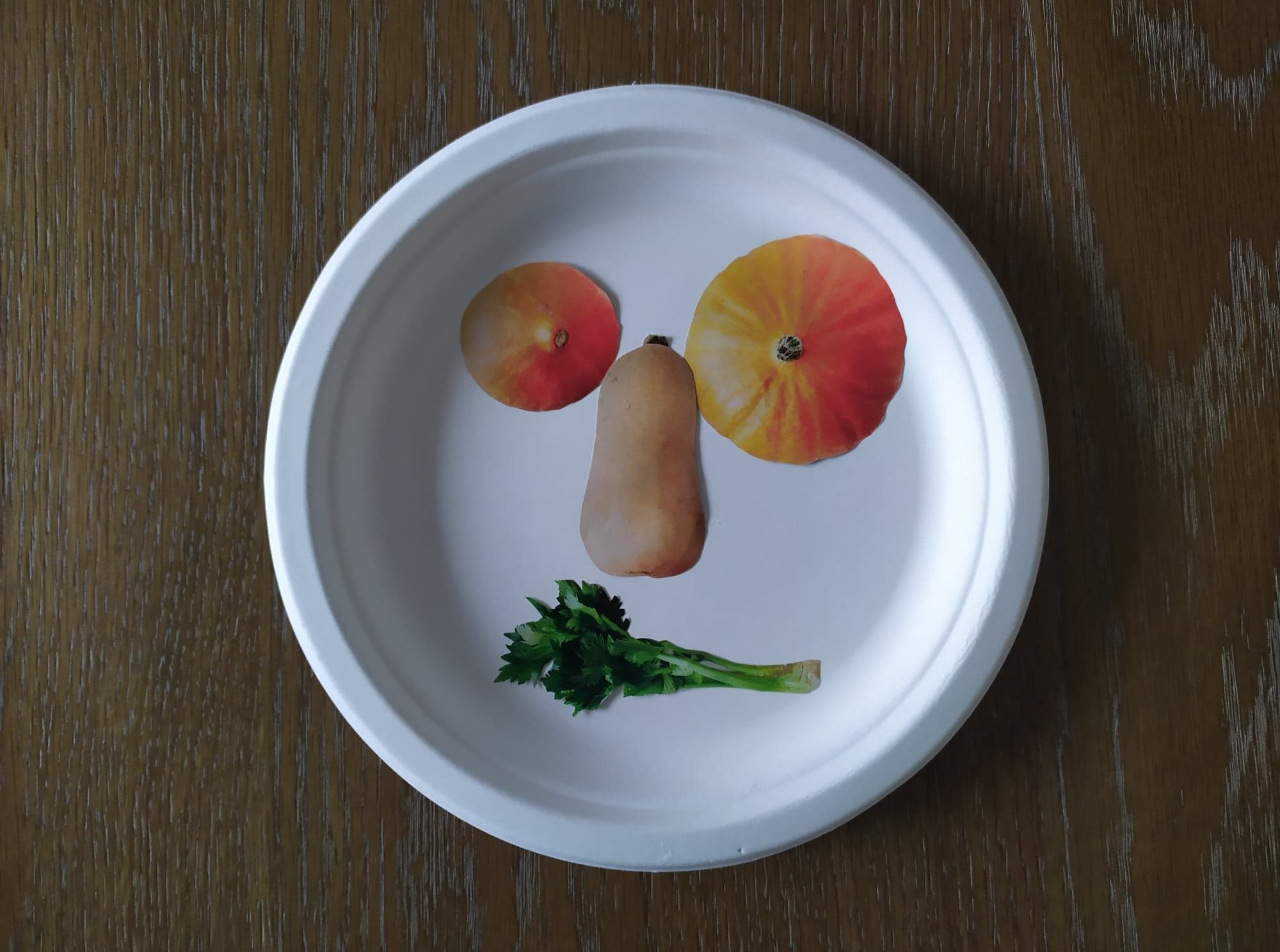 Construire plusieurs visages à l’aide des aliments découpés en les positionnant simplement sur l’assiette.