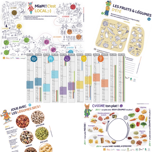 ↦ tout le kit pédagogique des Aventuriers du Goût, comprenant les outils thématiques imprimés sur support effaçable de haute qualité