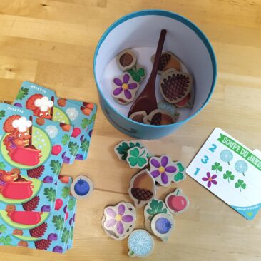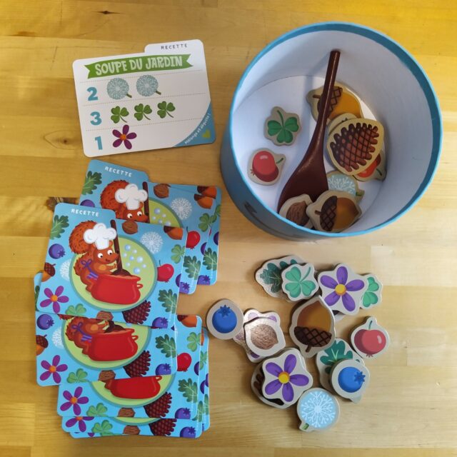 Identifiez les ingrédients de chaque recette, triez-les et mettez-les un par un dans la casserole en respectant les quantités ! Mélangez soigneusement avec la cuillère. Réconfortant comme un potage, La Soupe des Écureuils est un jeu de comptage et de manipulation qui invite à partager des moments complices avec les enfants.