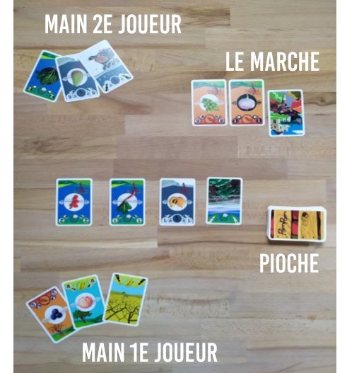 - Pour raccourcir le temps de jeu, ou pour une 1e partie on peut jouer avec une seule carte marché et chercher à ne réaliser qu’une paire de fruit et de légume.