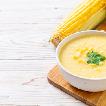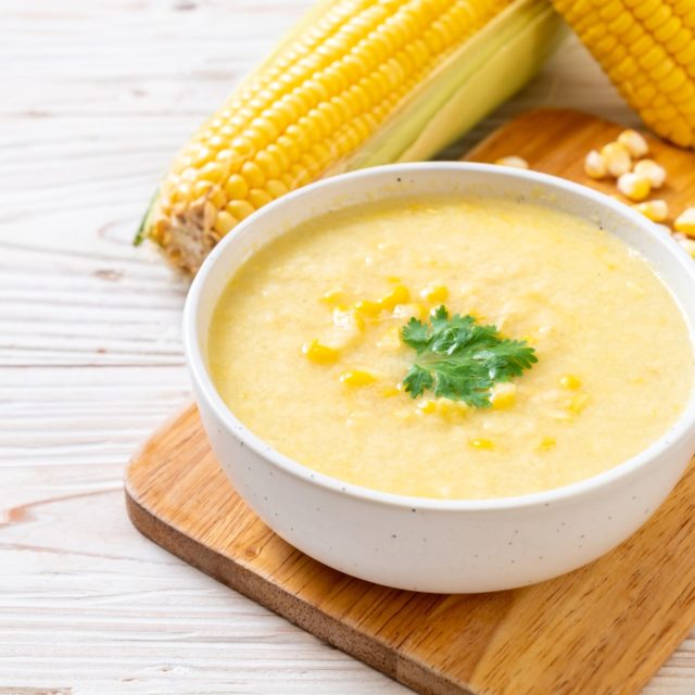 Servir la soupe dans des bols, ajouter quelques grains de maïs.