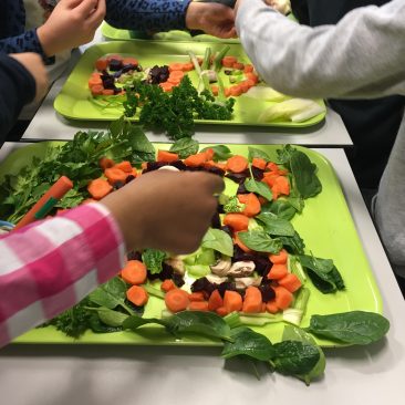 Donner les noms des légumes présents sur la table, les laver, les éplucher si nécessaire et les faire les premières grosses découpes à l’aide d’un adulte.